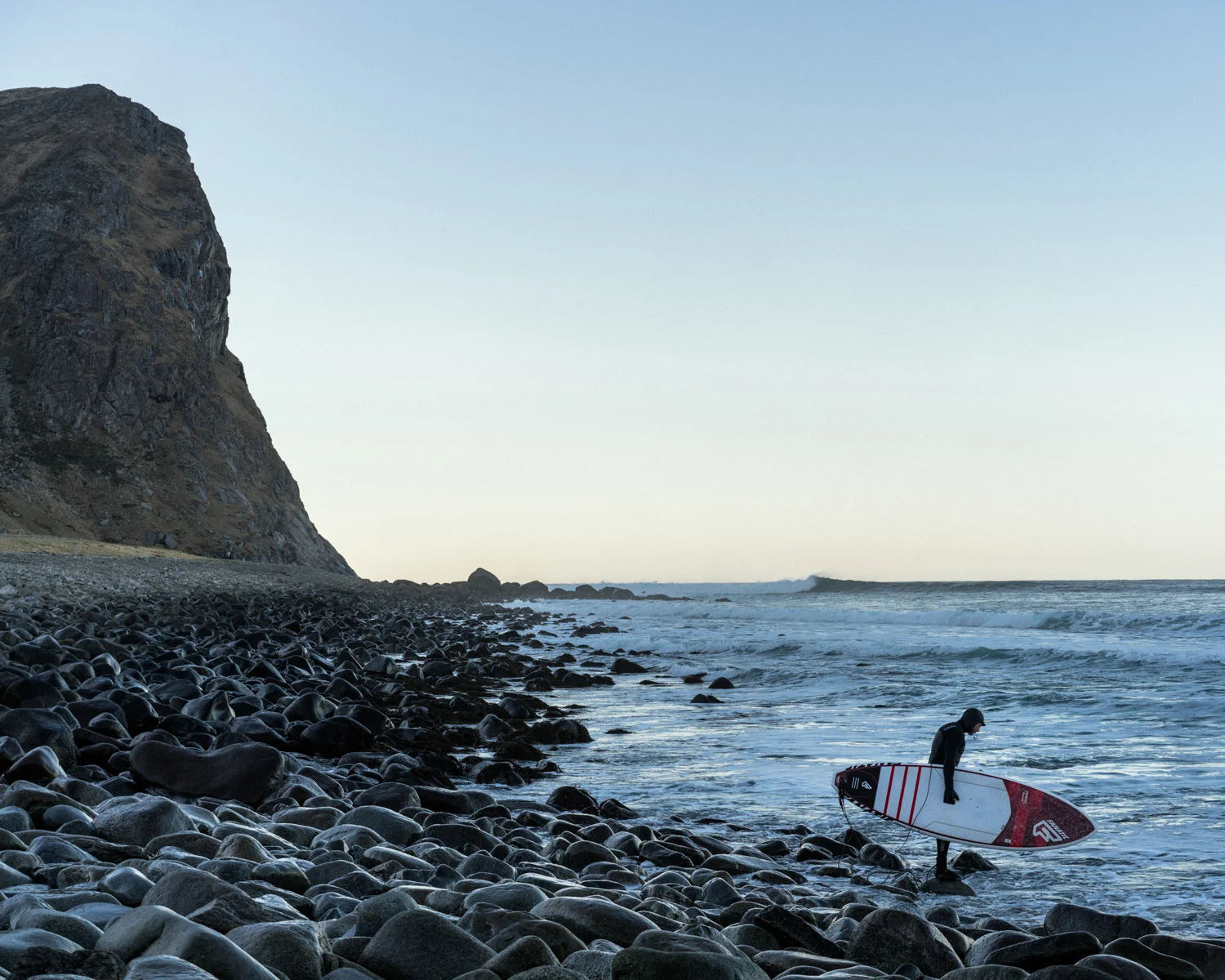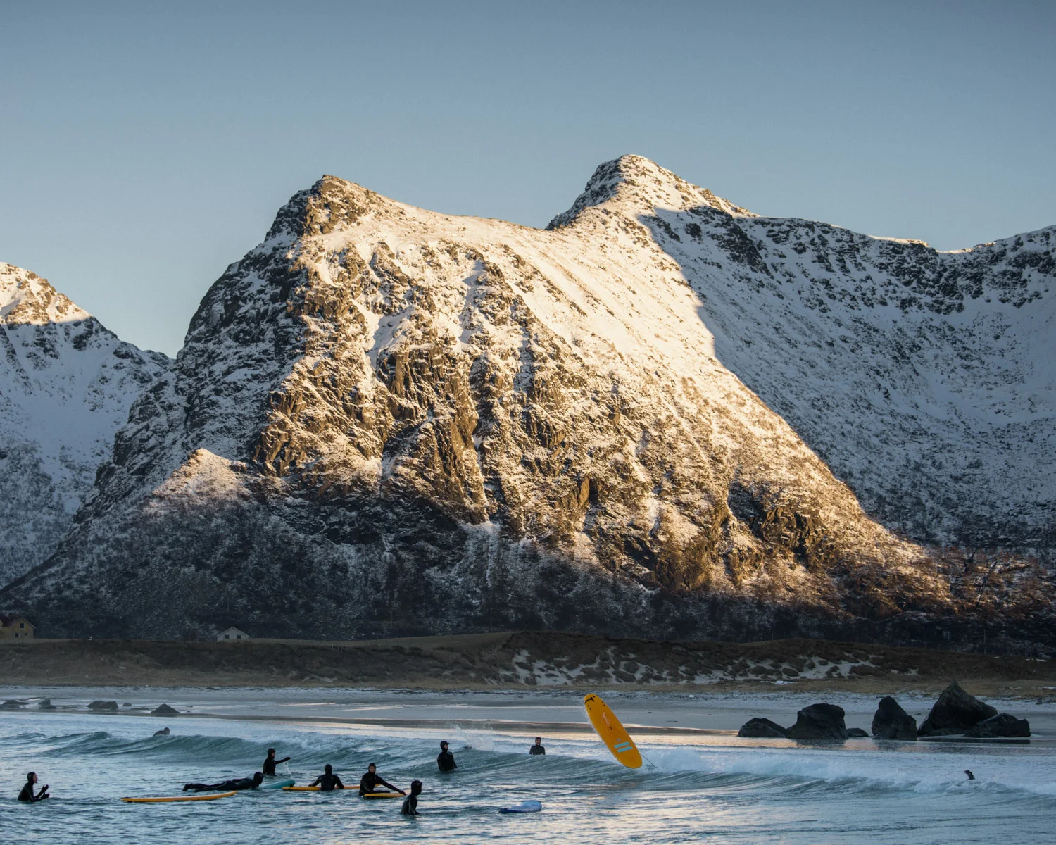Even though we are hundreds of kilometers North of the Arctic Circle , the most popular activity here is surfing . The Lofoten islands are famous worldwide for their scenic fishing villages surrounded by snow mountains, icy bays and northern lights. Although it is cod fishing that has traditionally played the dominant role in the islands’ history a local surfing scene has emerged in the little bay of Unstad, cut off from the rest of the island by mountains. Nowadays, what used to be the village school has become a surf camp welcoming adventurers and professional surfers from all around the world coming to defy the best waves of the Arctic.